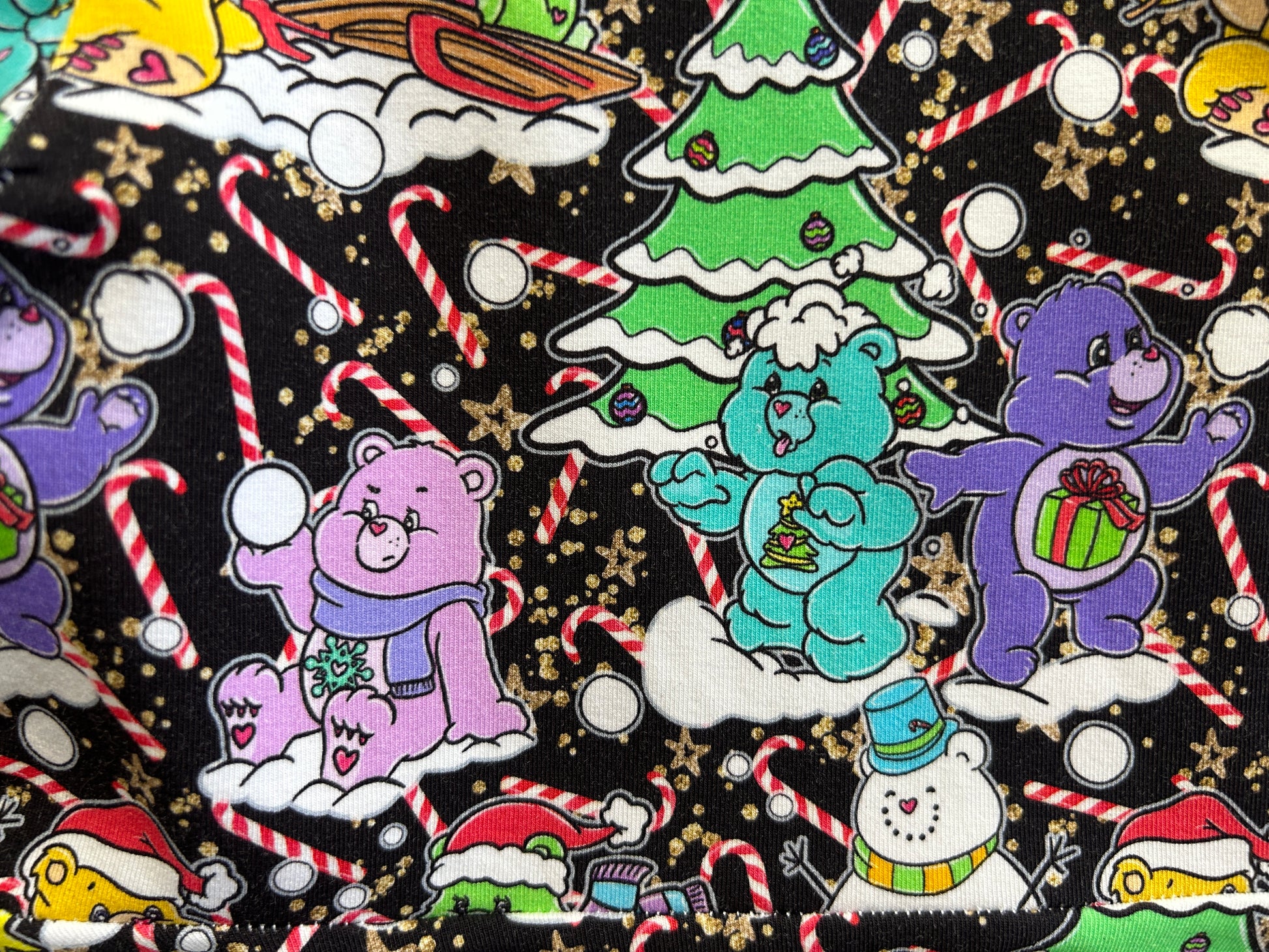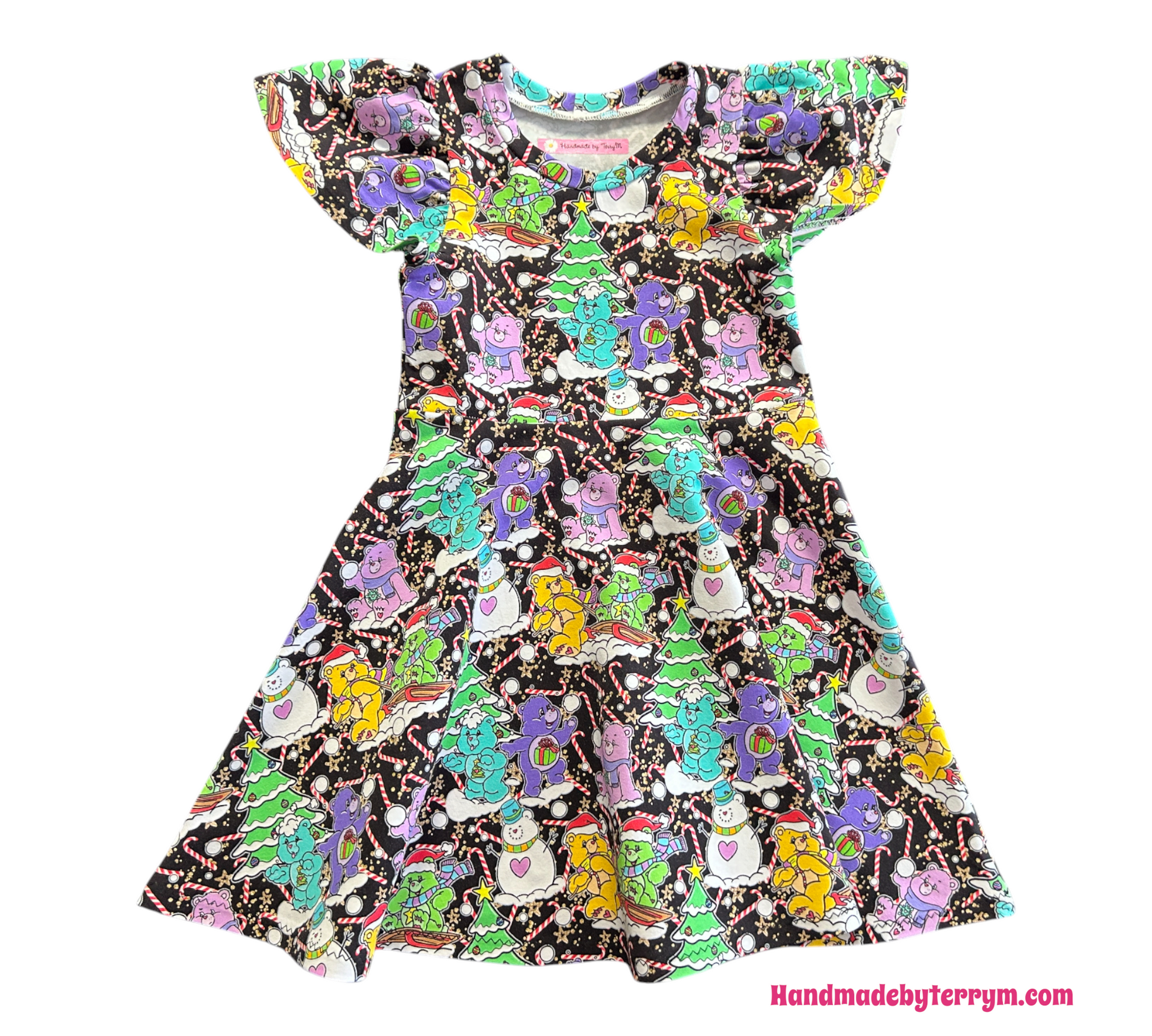 This playful Christmas Carebear Dress for size 4 features cheerful Carebears in vibrant colours set against a sleek black background adorned with festive Christmas trees and twinkling lights. The design is brought to life with a fun skater skirt and flutter sleeves, creating a joyful outfit perfect for holiday celebrations and magical moments.