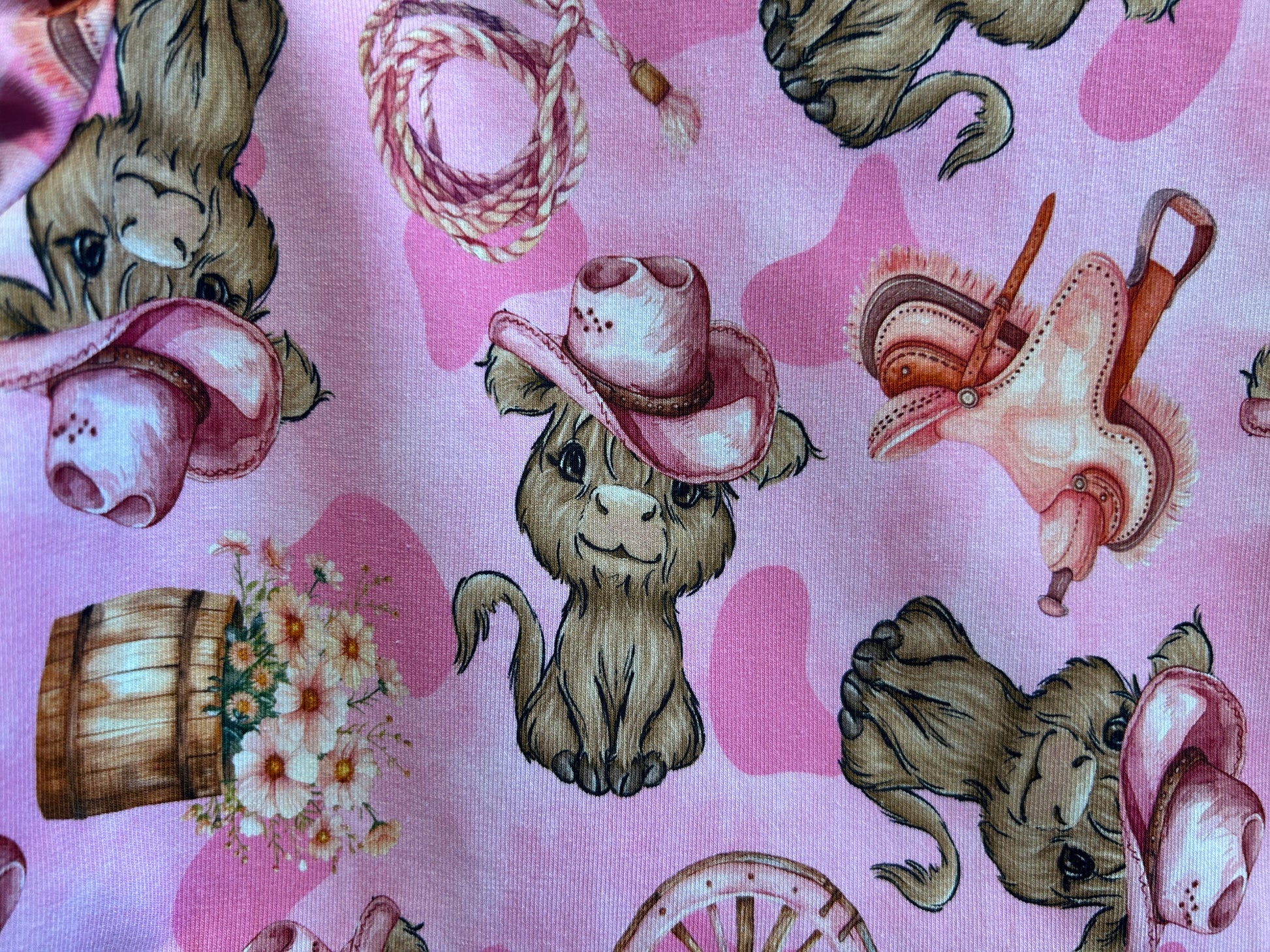 Meet your little cowgirl's new favourite dress! This adorable Highland cow design features a sweet pink cow hat detail set against a cheerful pink background. The playful skater skirt silhouette twirls beautifully, while flutter sleeves add an extra touch of charm and movement. Perfect for playdates, parties, or everyday adventures, this dress combines whimsy with comfort. Ideal for size 5, it's sure to bring smiles and giggles wherever she goes!