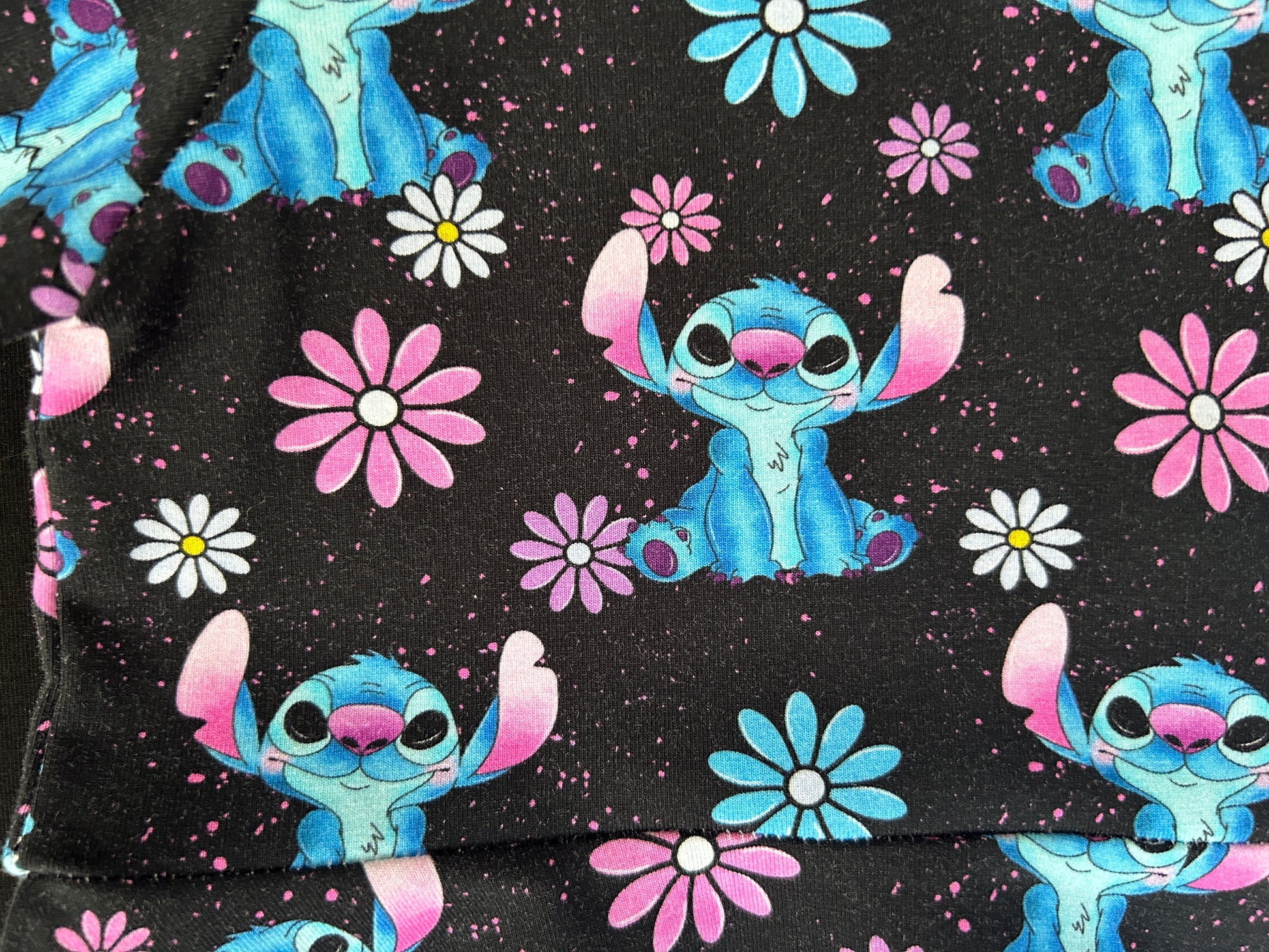 This playful dress features a sleek black background accented by a charming blue stitch figure. Flutter sleeves add a touch of whimsy, while the skater skirt creates a fun, flirty silhouette perfect for twirling through any occasion. Ideal for size 2, it combines comfort and style effortlessly.