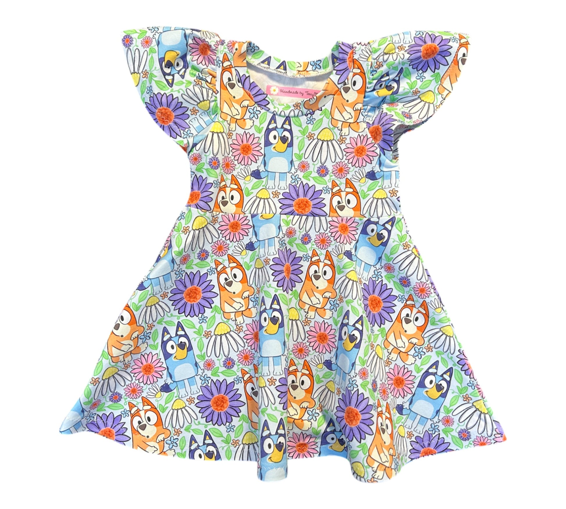 Bring a burst of fun to any little girl’s wardrobe with the Flower Bluey Dress in size 1. Featuring a cheerful bluey and daisy background, this dress captures playful charm. The skater skirt twirls with every step, while flutter sleeves add a sweet, airy touch. Perfect for sunny days full of adventure and joyful play.