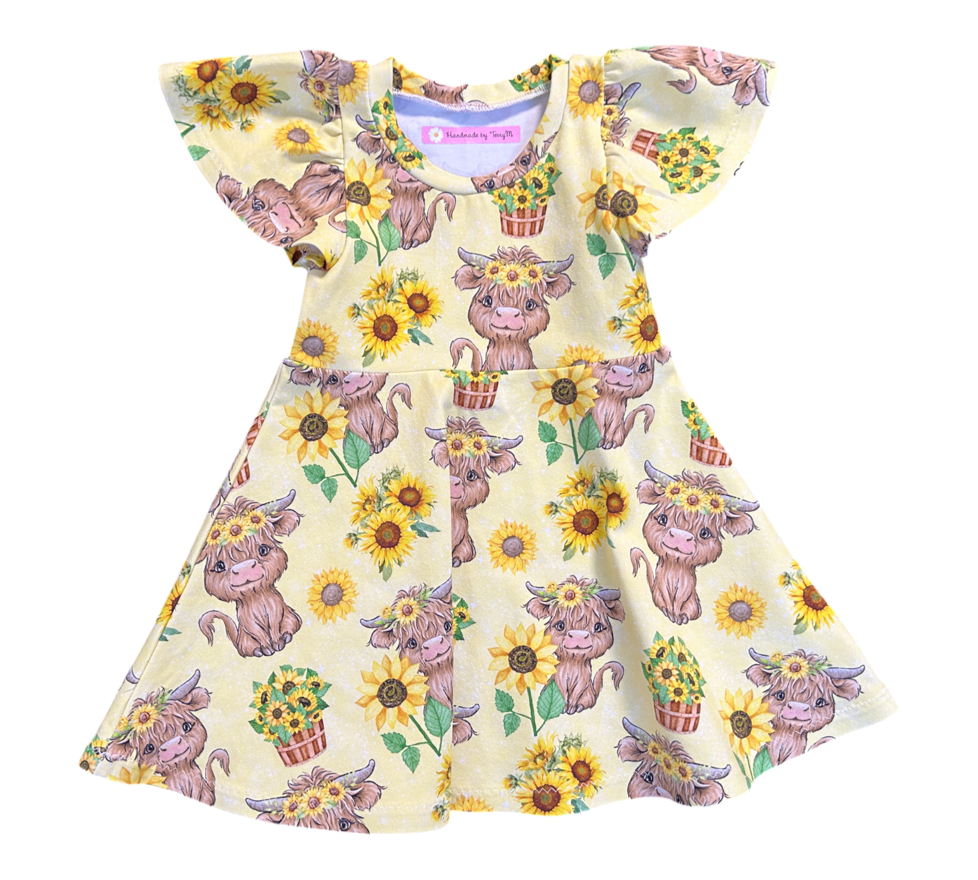 Moooo-ve over, boring dresses! This Highland cow dress is udderly adorable with its cute highland cows and sunny sunflowers. The flutter sleeves add a playful touch while the skater skirt is perfect for twirling. A must-have for any little fashionista.