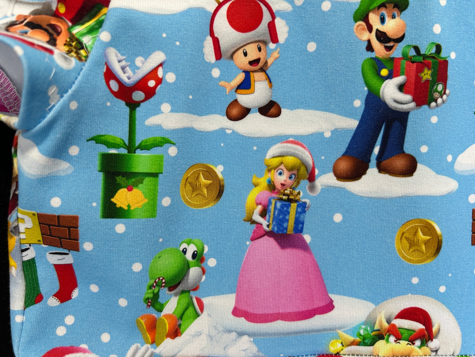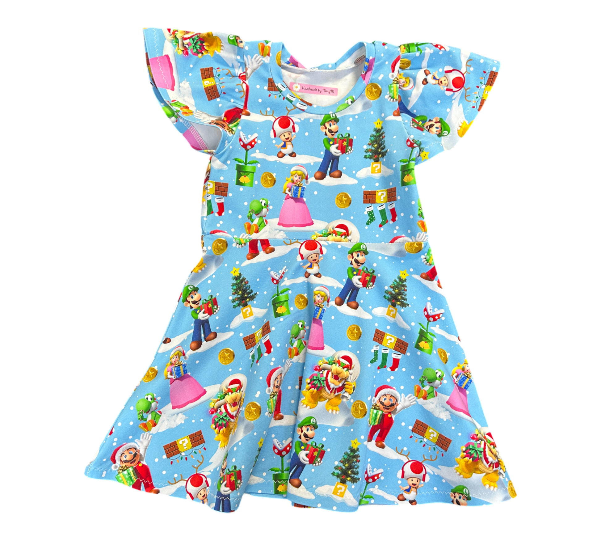 Celebrate the festive season with this playful Mario Gang Christmas Dress for size 6. Featuring Mario, Luigi, Princess Peach, Yoshi, and Bowser set against a charming blue Christmas-themed background, it brings holiday magic to life. The flutter sleeves add a whimsical touch, while the skater skirt gives twirling fun at every party. Perfect for little fans who want to shine bright and enjoy the holiday spirit in style!