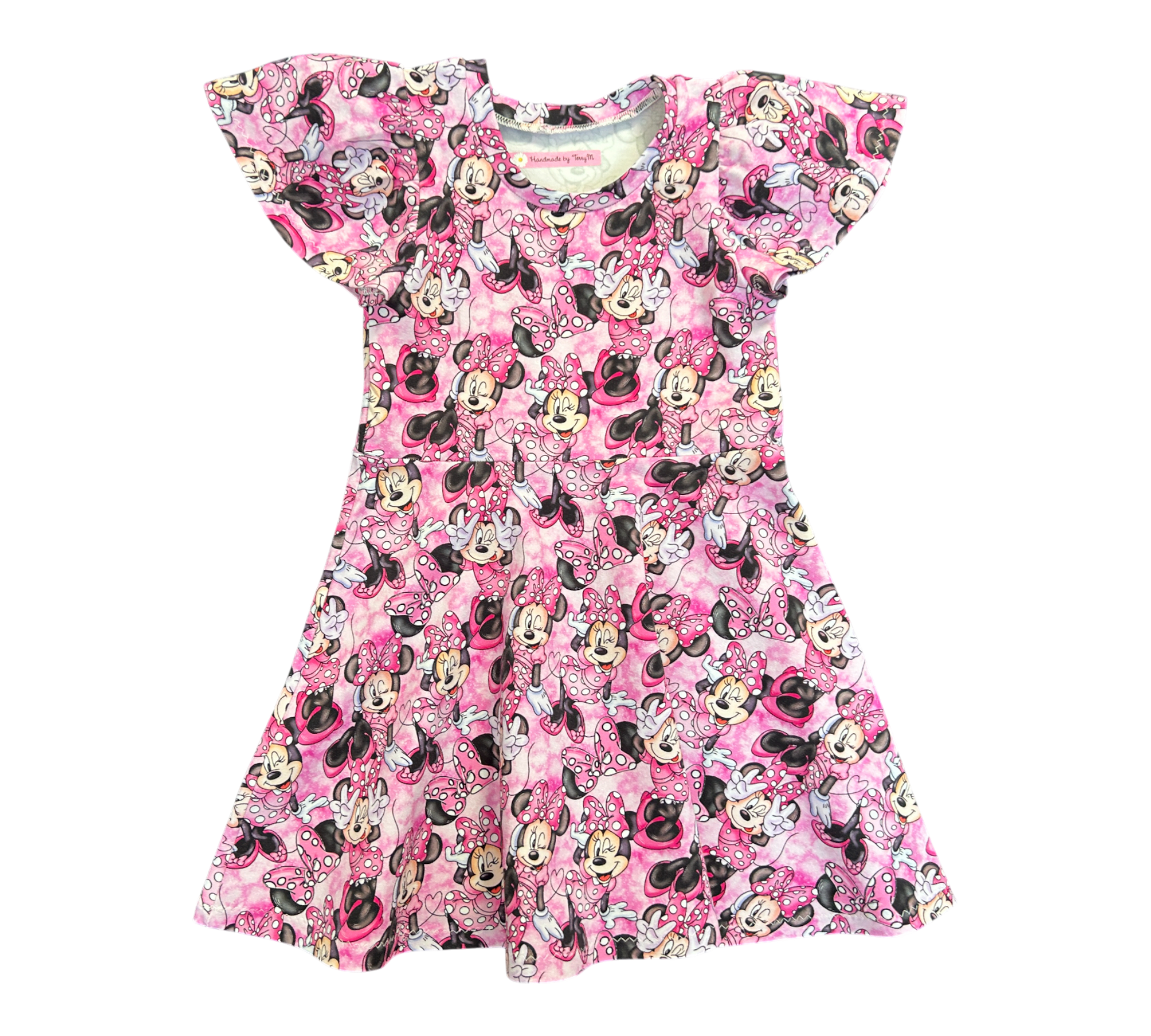 This playful Minnie Dress in size 3 features a bright pink background with a sassy Minnie print, perfect for little trendsetters. The skater skirt adds a twirl-worthy flair, while flutter sleeves bring a fun and breezy touch. Ideal for adding charm and comfort to any occasion.