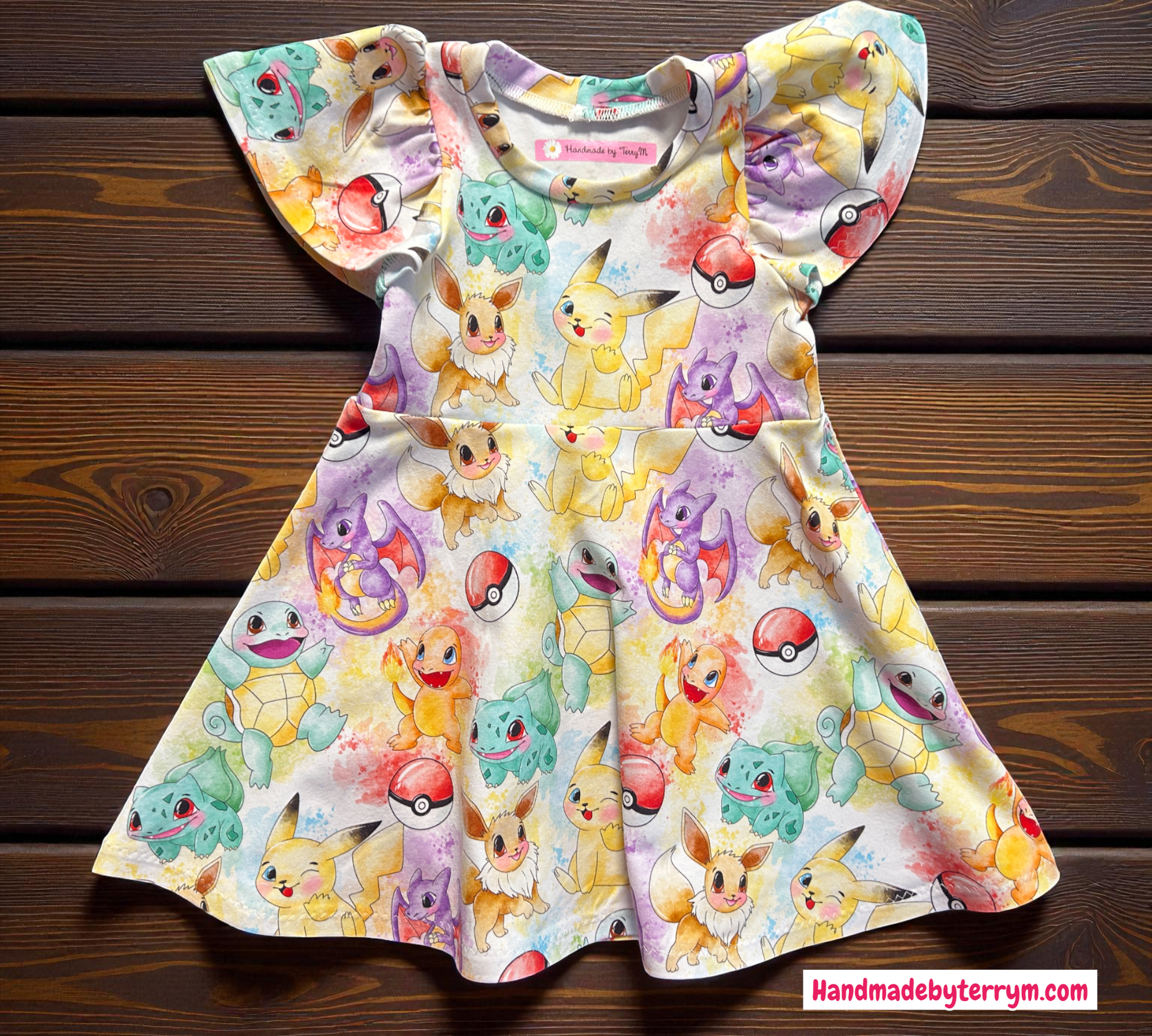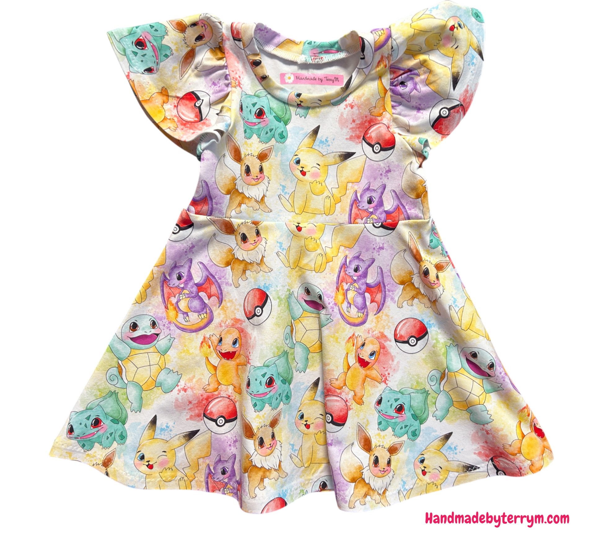 This one-of-a-kind dress is for the most dedicated Pokémon fanatics! Flutter sleeves with a skater skirt, this handmade size 1 dress is ready to be added to your little one's wardrobe. Featuring a fun Pokémon pattern, it's perfect for everyday excursions. Gotta catch 'em all - and look cute doing it!