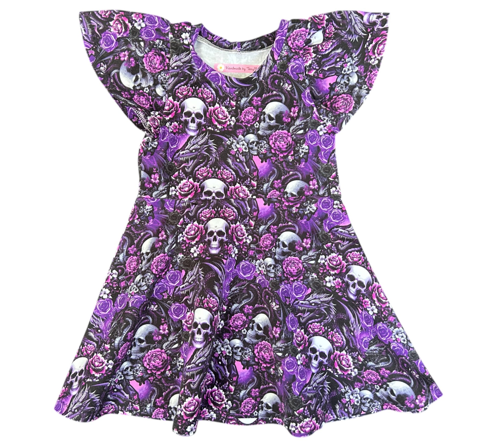 This playful Purple Skulls & Dragons Dress in size 2 features flutter sleeves and a fun skater skirt, perfect for twirling and imaginative adventures. Its bold design brings a cool edge to playful days, combining comfort with vibrant style for little trendsetters.