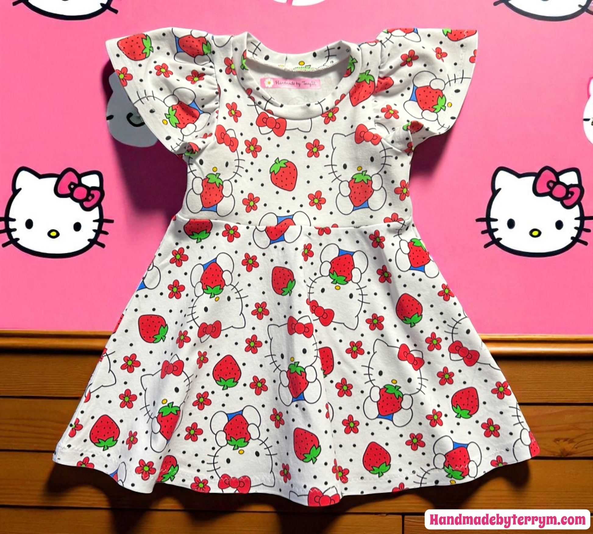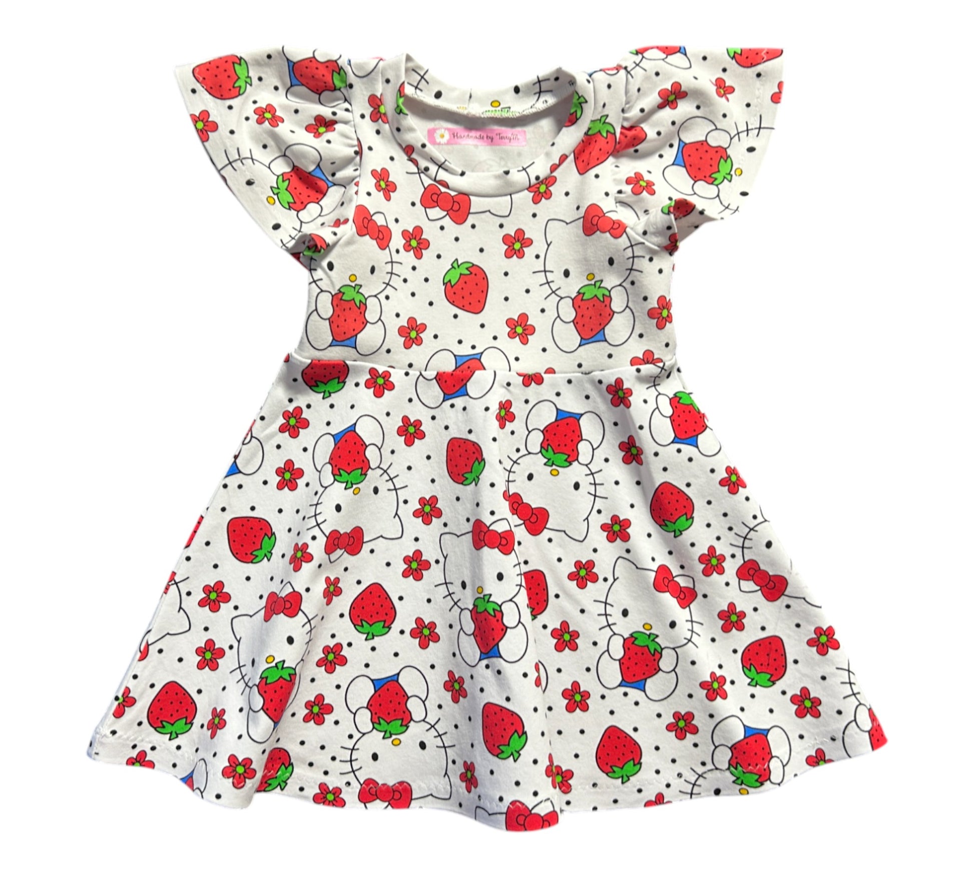 This delightful Hello Kitty dress features a crisp white background adorned with charming strawberries, perfect for adding a touch of sweetness to any outfit. Designed with playful flutter sleeves and a fun skater skirt, it offers both comfort and twirl-worthy style for size 1. Ideal for lively days and special occasions alike, this dress brings a cheerful vibe to your little one’s wardrobe.