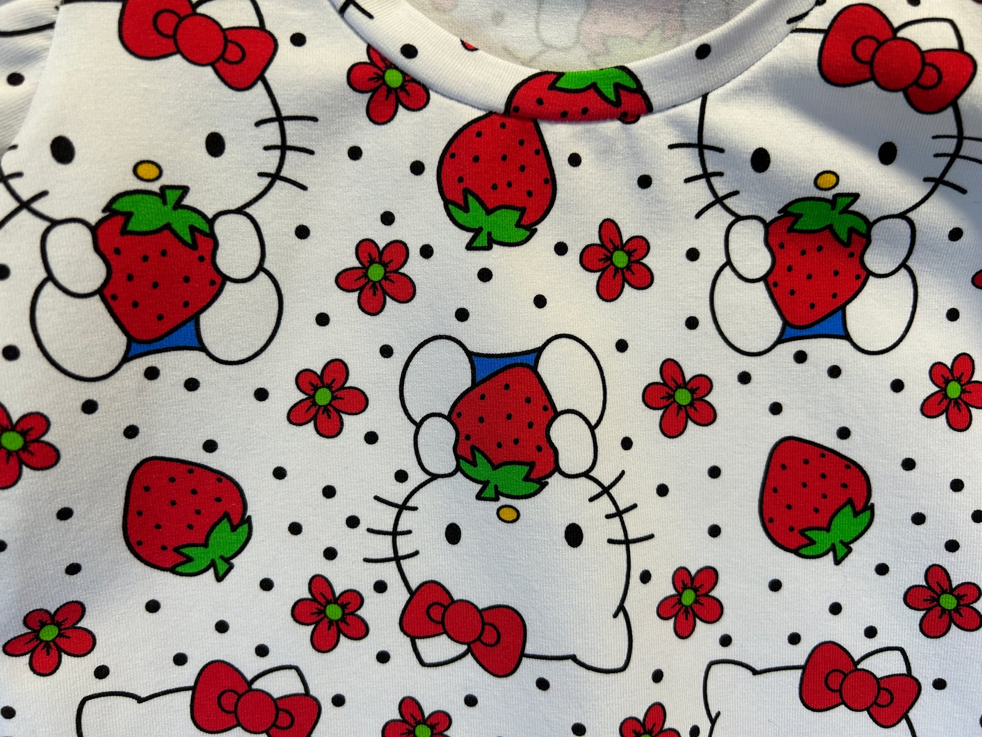 Bring a splash of fun to your little one’s wardrobe with this Strawberry Hello Kitty T-Shirt. Featuring charming flutter sleeves and a sweet strawberry print, it’s perfect for playful days and sunny adventures. Made for comfort and cuteness in size 1, this tee is sure to be an instant favorite.